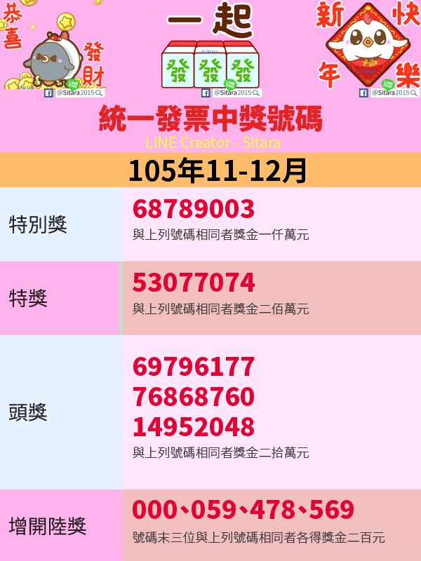 LINE - 2016(105年)11.12月統一發票中獎號碼