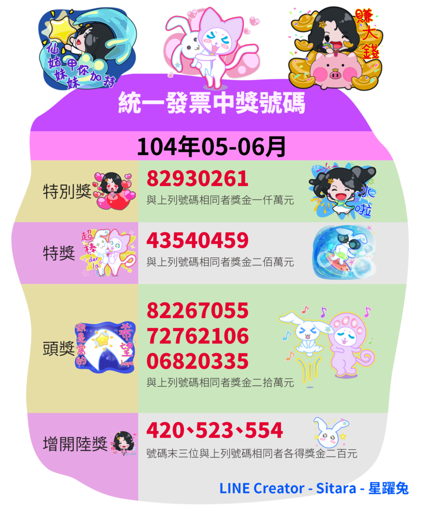 LINE - 2015(104年)05.06月統一發票中獎號碼